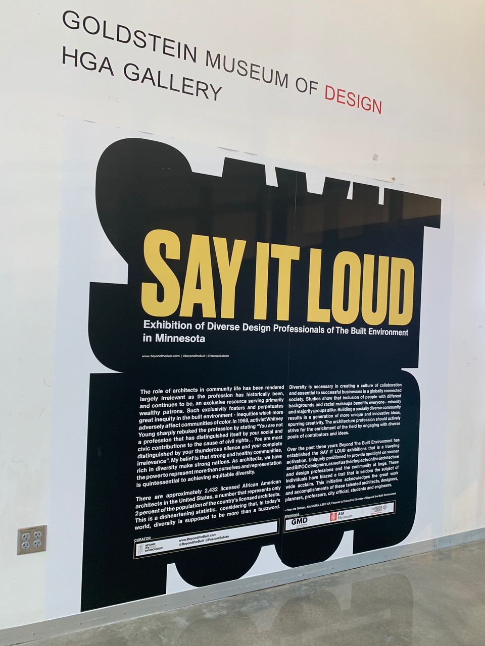 Last week to visit the Say It Loud | Beyond the Built Environment exhibit featuring the work of Minnesota diverse designers including Kristine Anderson, Tammy Angaran, Abimbola Asojo, Alicia Belton, Nina Ebbighausen, James Garrett Jr. Tu-Anh bui Johnson, Karen Lu, Joy Martin, Audrey Jo McGuire, Jennifer Newsome, Heather Novak-Peterson, Anna Pravinate, Mary Springer, Lyssa Washington, Celina Nelson, Damaris Hollingsworth, Trevor Bullen, Tasoulla Hadjiyanni